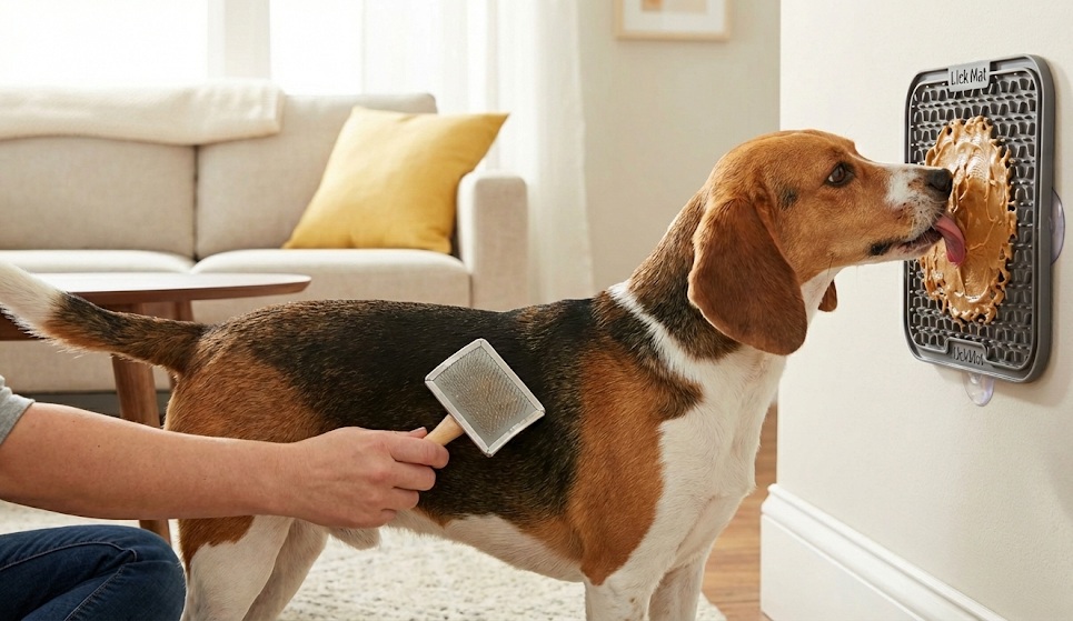 Zacznij od zera: Pokaż psu szczotkę, nie dotykając go nią. Jeśli pies na nią spojrzy i nie ucieknie – nagroda (super smaczek!). Chcemy zmienić skojarzenie z “szczotka = ból” na “szczotka = pasztet”.